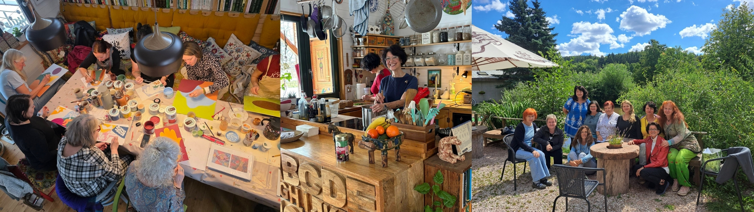 "Milá Evičko a Janinko. Celým srdcem děkuji za nádherný den ve Svatojánu, ve kterém jsem se mohla přenést do jiného světa. Nejednalo se pouze o "kurz malování". Bylo to spočinutí ve vlastní tvořivé síle doplněné vaší laskavou až maminkovskou péčí. Den plný milých setkání a dobrůtek, kdy jsem čekala pouze pohoštění a dostalo se mi tříchodového menu na úrovni špičkové veganské restaurace!. Tvořila jsem si obrázek jako vlastní projekci - což byl proces doslova léčivý! Závěrem bych chtěla "kurz" doporučit nejenom jako příležitost naučit se novou techniku malování, ale také jako čas ,kdy nemusím myslet ani starat se o nic ❤️ S úctou ze srdce děkuji a když to bude jenom trochu možné, nevynechám jedinou příležitost užít si tak naplňující čas-čas jenom sama pro sebe v nádherném prostředí s obdobně naladěnými lidmi."